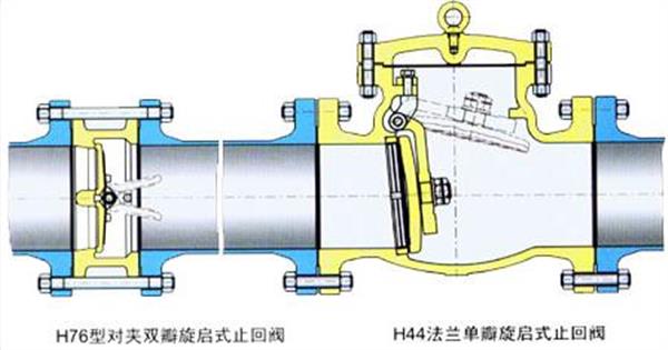 對夾雙瓣(蝶式)旋啟式止回閥與法蘭單瓣旋啟式止回閥的對比: